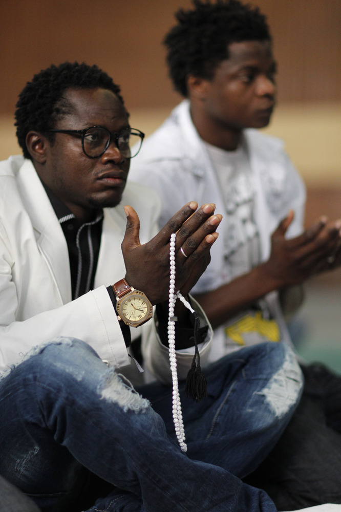 Muslim immigrants living in Greece offer Eid al-Adha prayers inside a venue