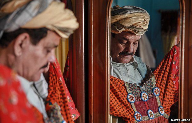 Here, Sultan Khan shows off his mother's dress from nearly a century ago.